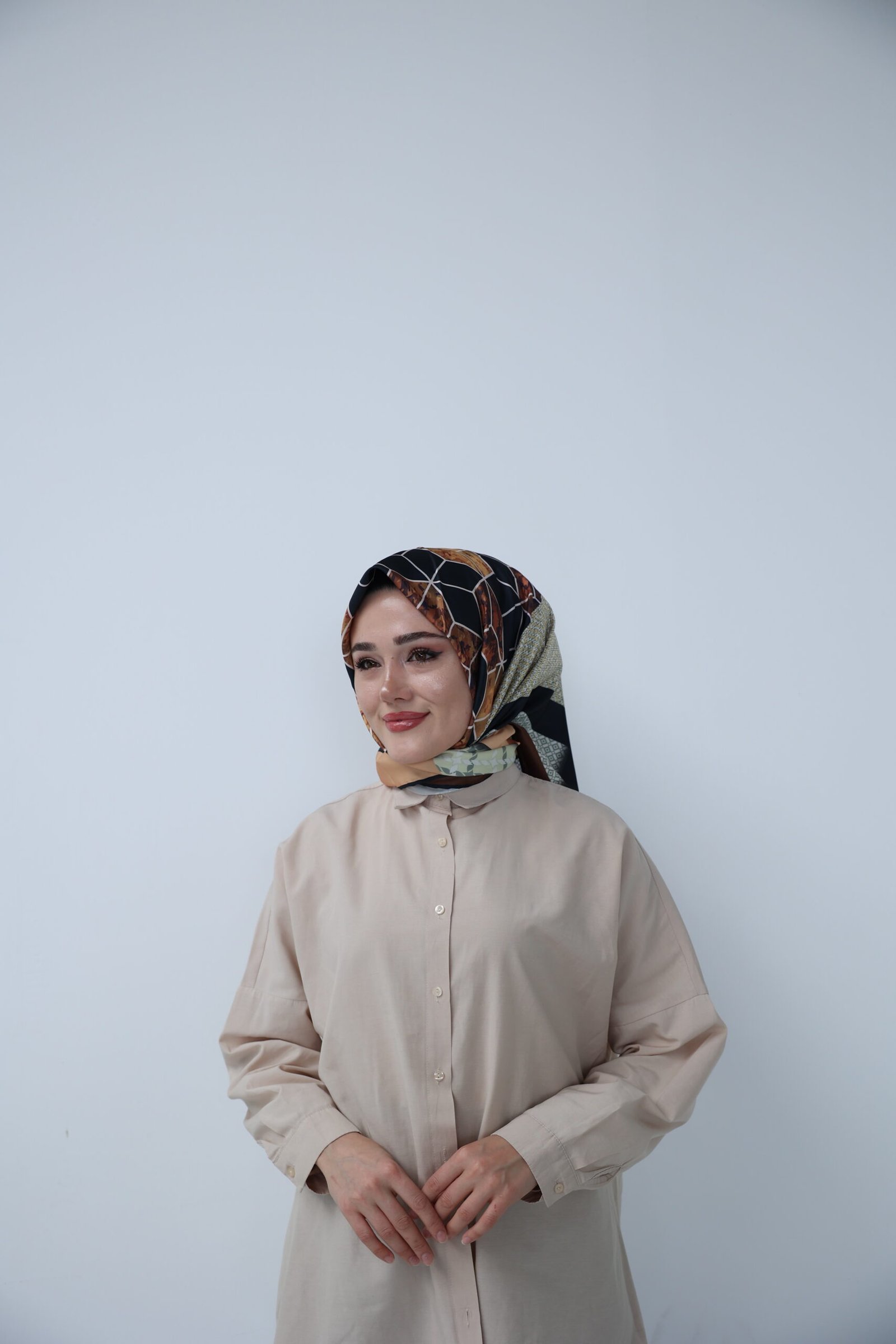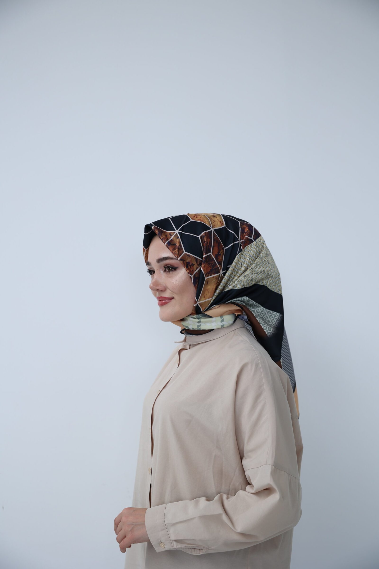 Altın, kahve ve siyah tonlarının mozaik desenle birleştiği, modern çizgilere sahip zarif eşarp modeli.