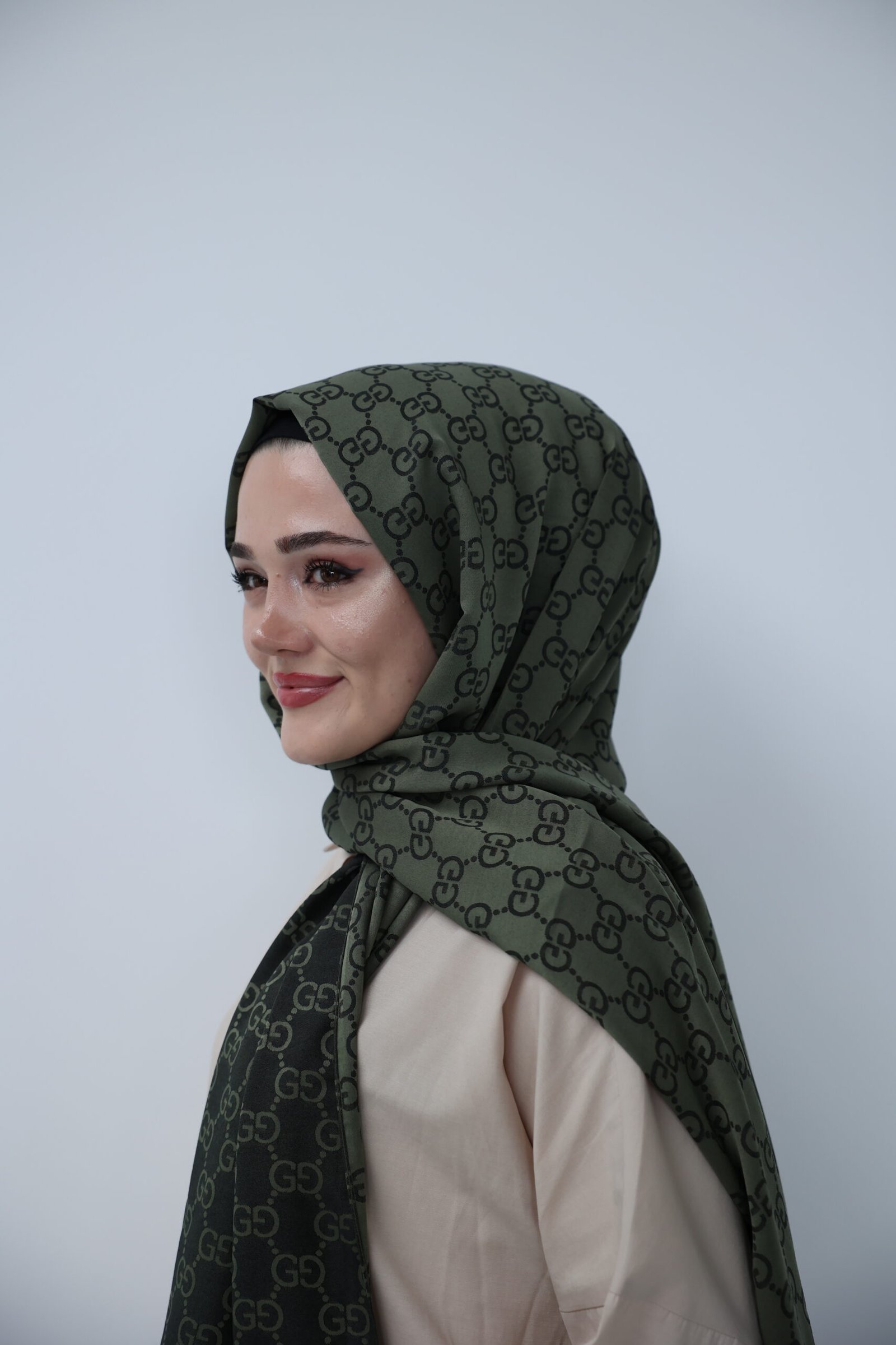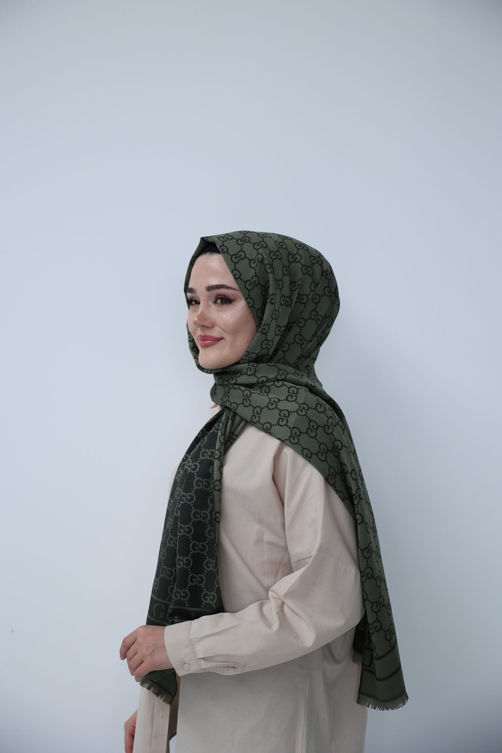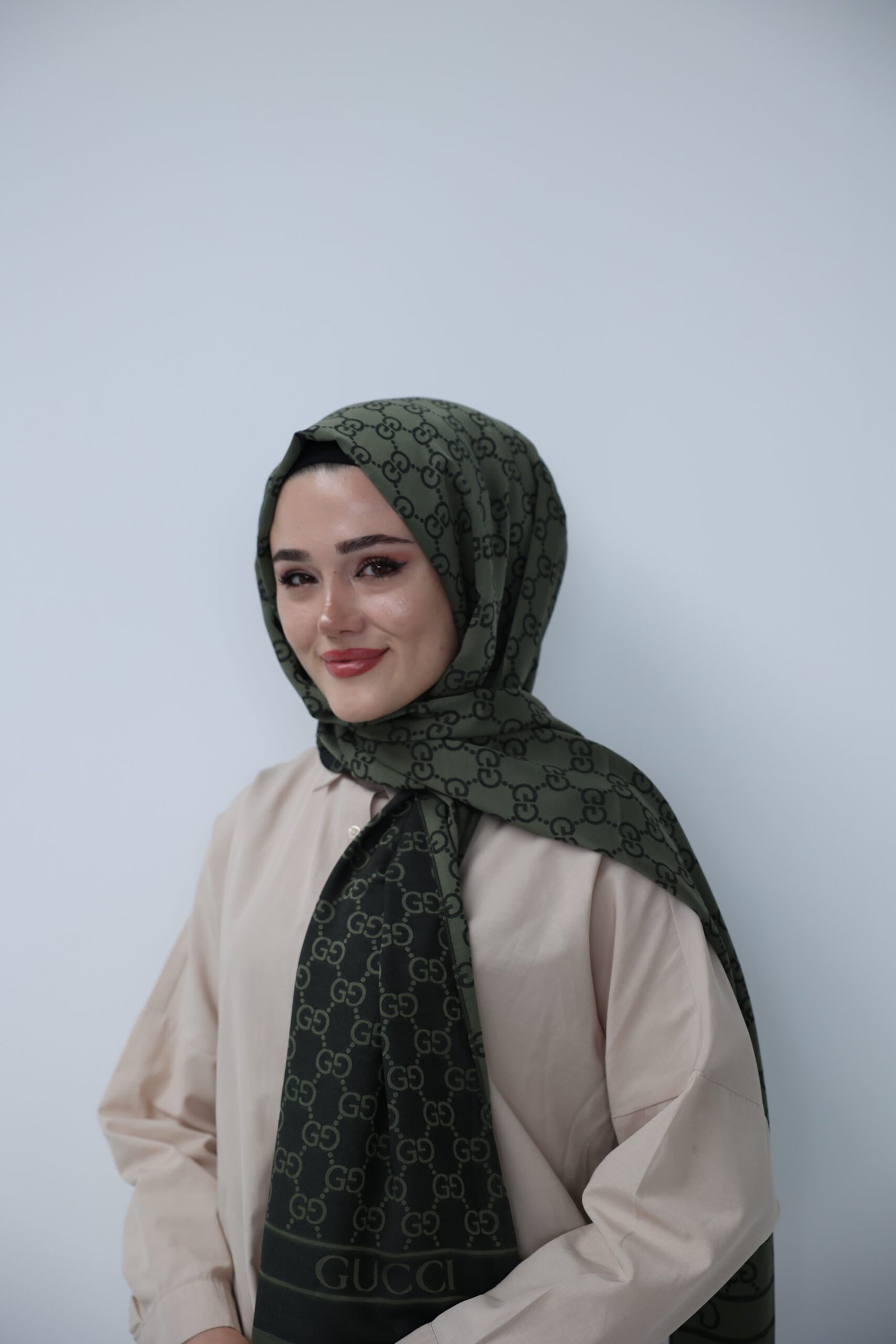 İkonik Gucci monogram deseni, klasik zarafete modern bir yorum katarken, haki rengin asaleti şala özgün bir karakter kazandırır.