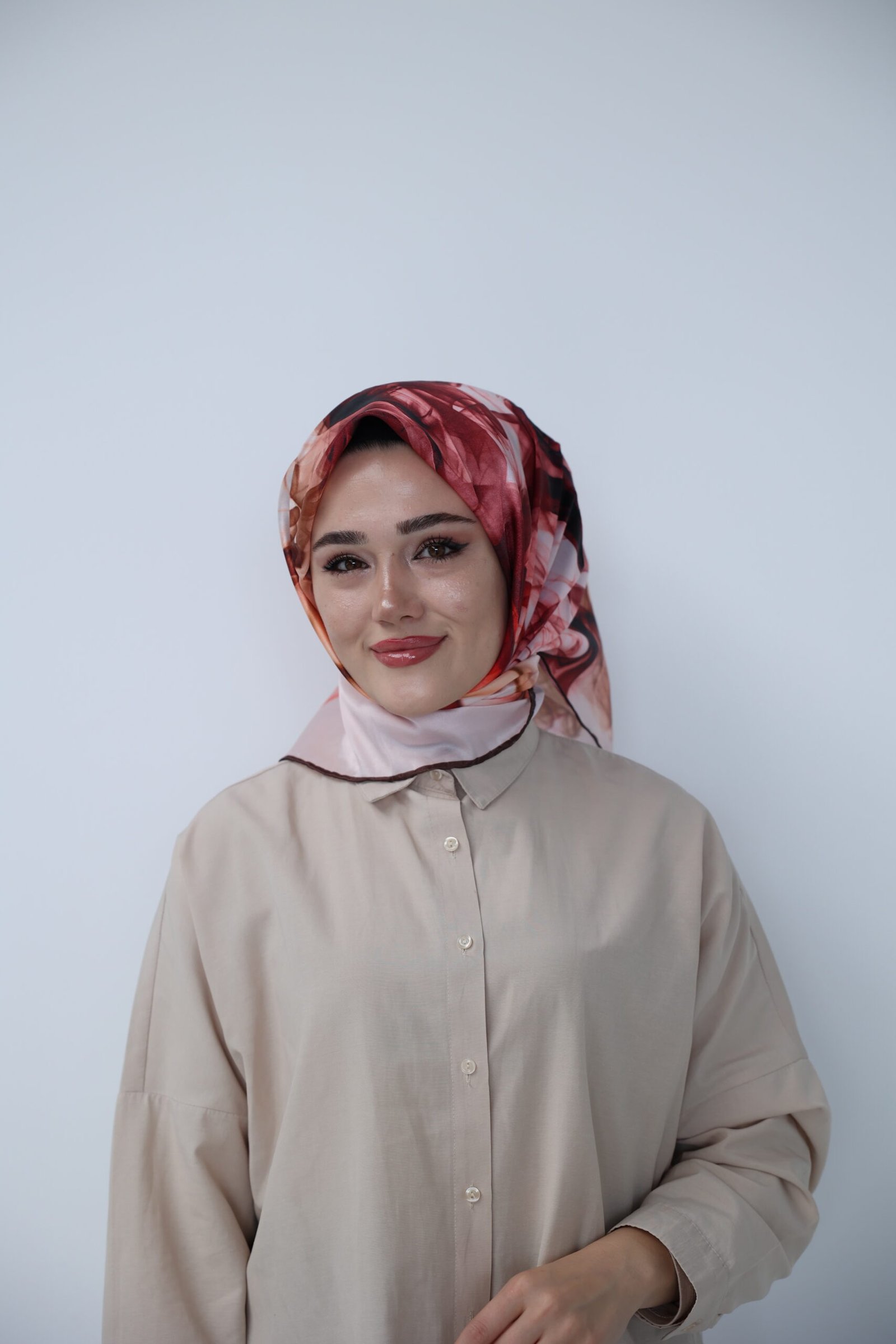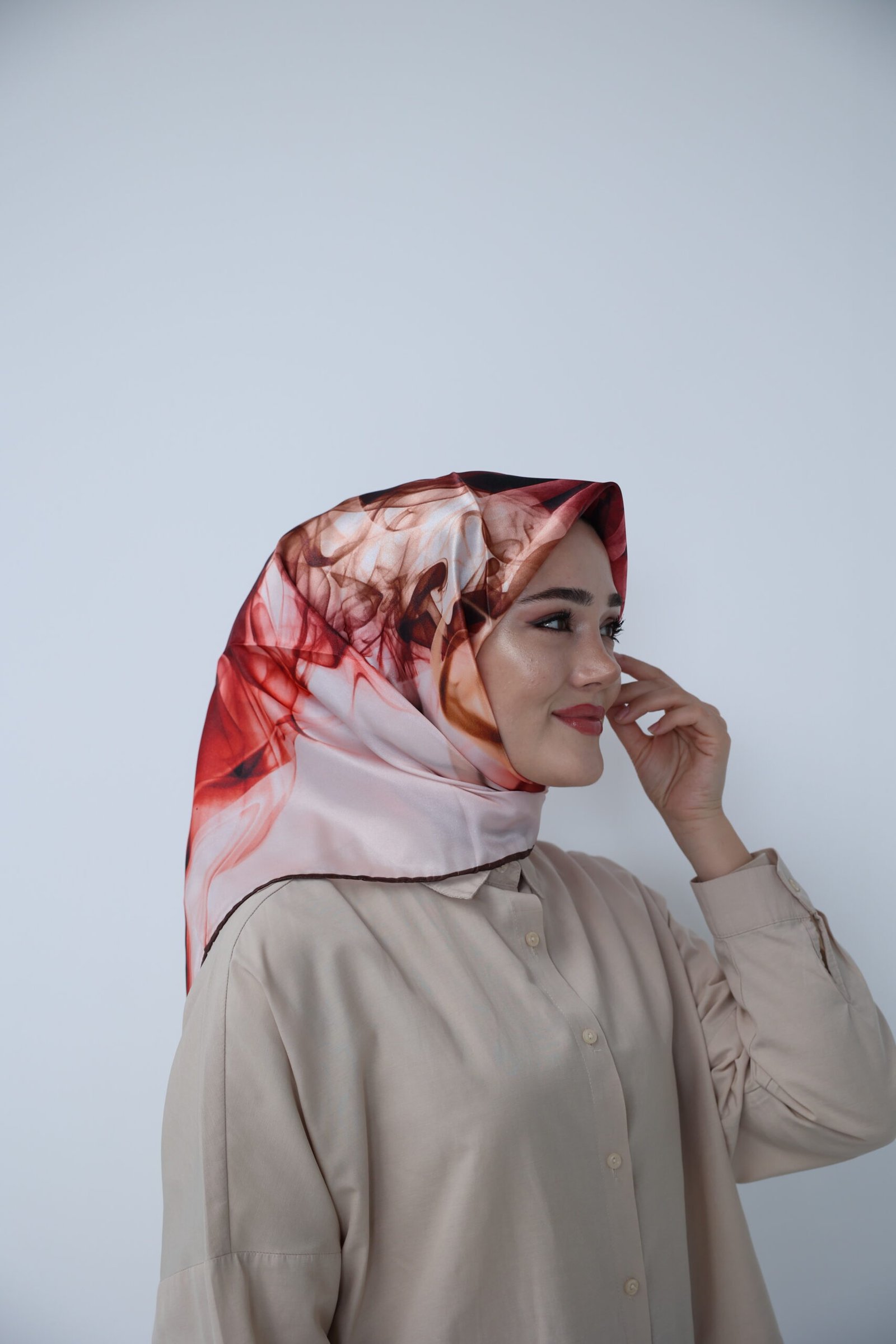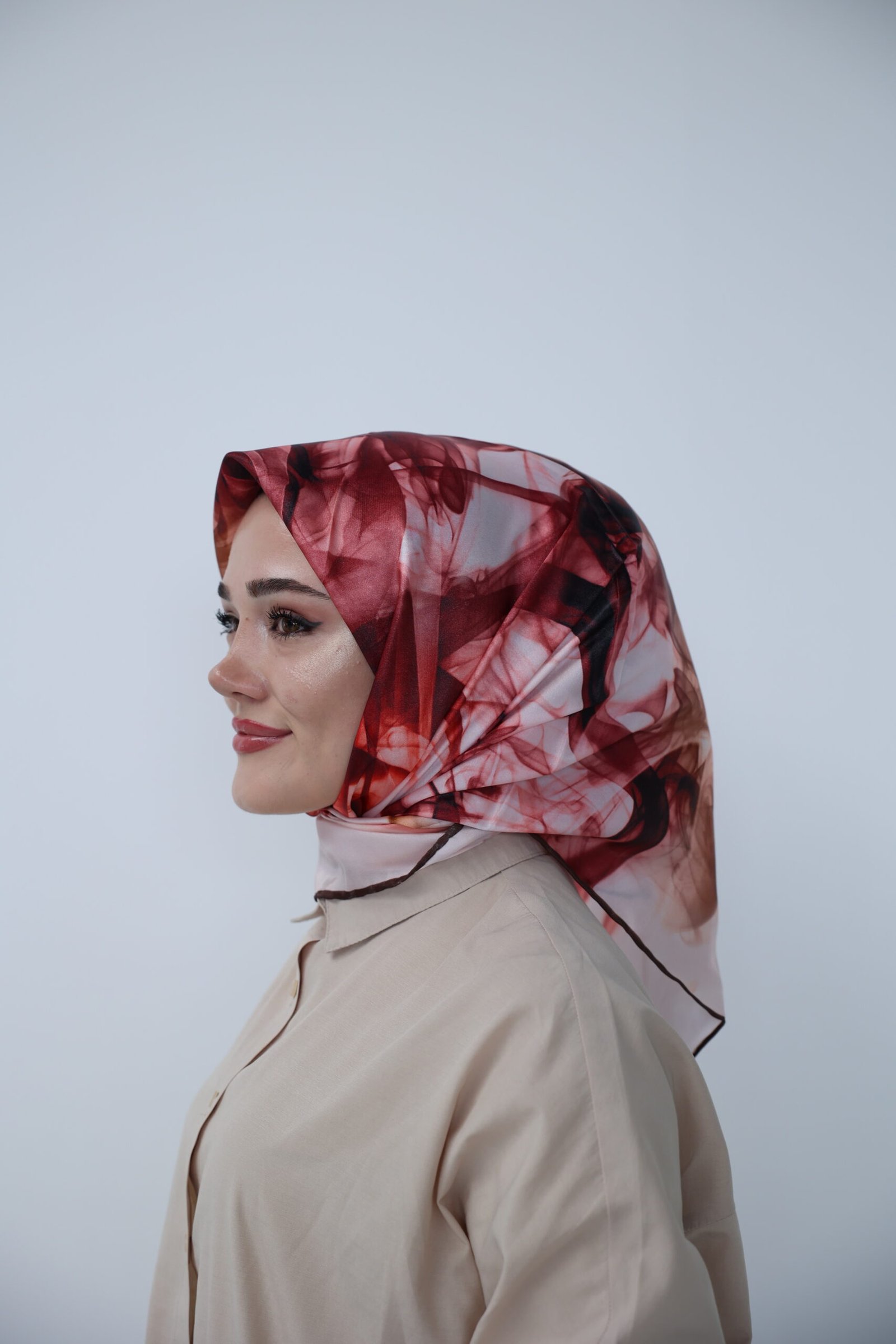 Kızıl ve kahve tonlarının duman efektiyle buluştuğu, zarif ve modern çizgilere sahip özel tasarım eşarp modeli.